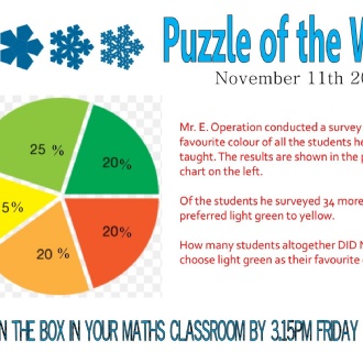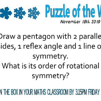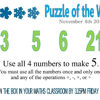 Published 03/11/19Have a go at this week’s puzzle. Put your solution on a piece of paper and drop it in one of the puzzle boxes at the back of your classroom before 3.15pm on Friday. Correct answers will collect 1 achievement point, whilst the best solution will receive three! Click on the attachments to see this week's puzzle and see the answer and winners from last time.