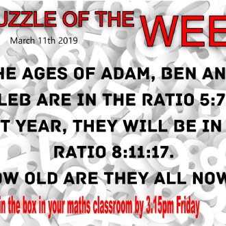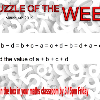 Have a go at this week’s puzzle. Put your solution on a piece of paper and drop it in one of the puzzle boxes at the back of your classroom before 3.15pm on Friday. Correct answers will collect 1 silver stars, whilst the best solution will receive three! Click on the attachments to see this week's puzzle and see the answer and winners from last time.