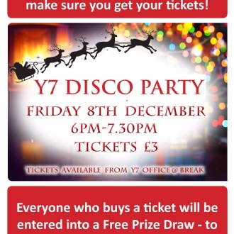 The Year 7 Disco Party takes place this week, on Friday 8 December, from 6pm to 7.30pm.