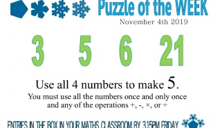 Have a go at this week’s puzzle. Put your solution on a piece of paper and drop it in one of the puzzle boxes at the back of your classroom before 3.15pm on Friday. Correct answers will collect 1 achievement point, whilst the best solution will receive three! Click on the attachments to see this week's puzzle and see the answer and winners from last time.